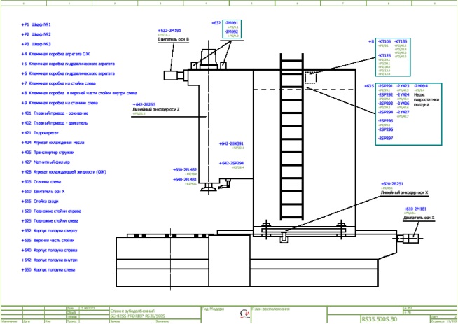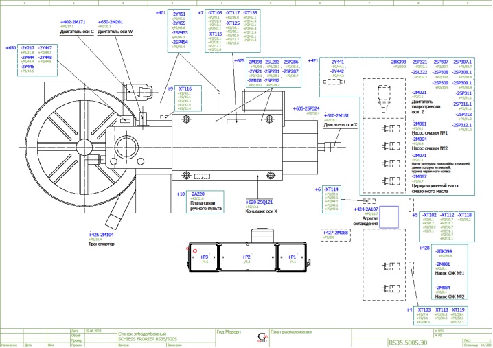 Задача: капитальный ремонт механики, изменение кинематики, отказ от "Гитары" и применение для связки осей при обработке зуба "Электронного редуктора", установка ЧПУ Sinumerik 840D sl. Разработка специального HMI для удобства работы без использования G-кодов. Разработка и изготовление новой гидростанции и гидросистем. Применение гидравлического пропорционального сервоклапана для управления долбяком с помощью модуля HLA и прямой линейной измерительной системы перемещений. До модернизации была установлена система ЧПУ Sinumerik 1980-x годов без возможности "скачивания" из неё PLC-программы.